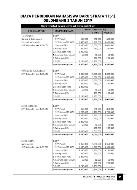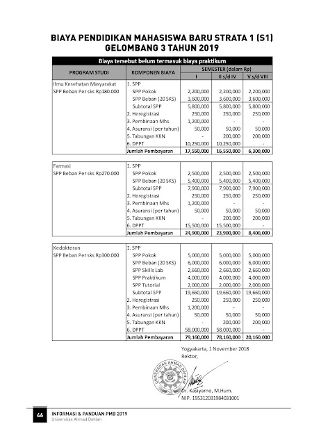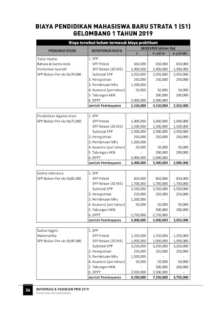 Adapun rincian biaya kuliah Universitas Ahmad Dahlan Tahun Ajaran 2019/2020 sebagai berikut :
