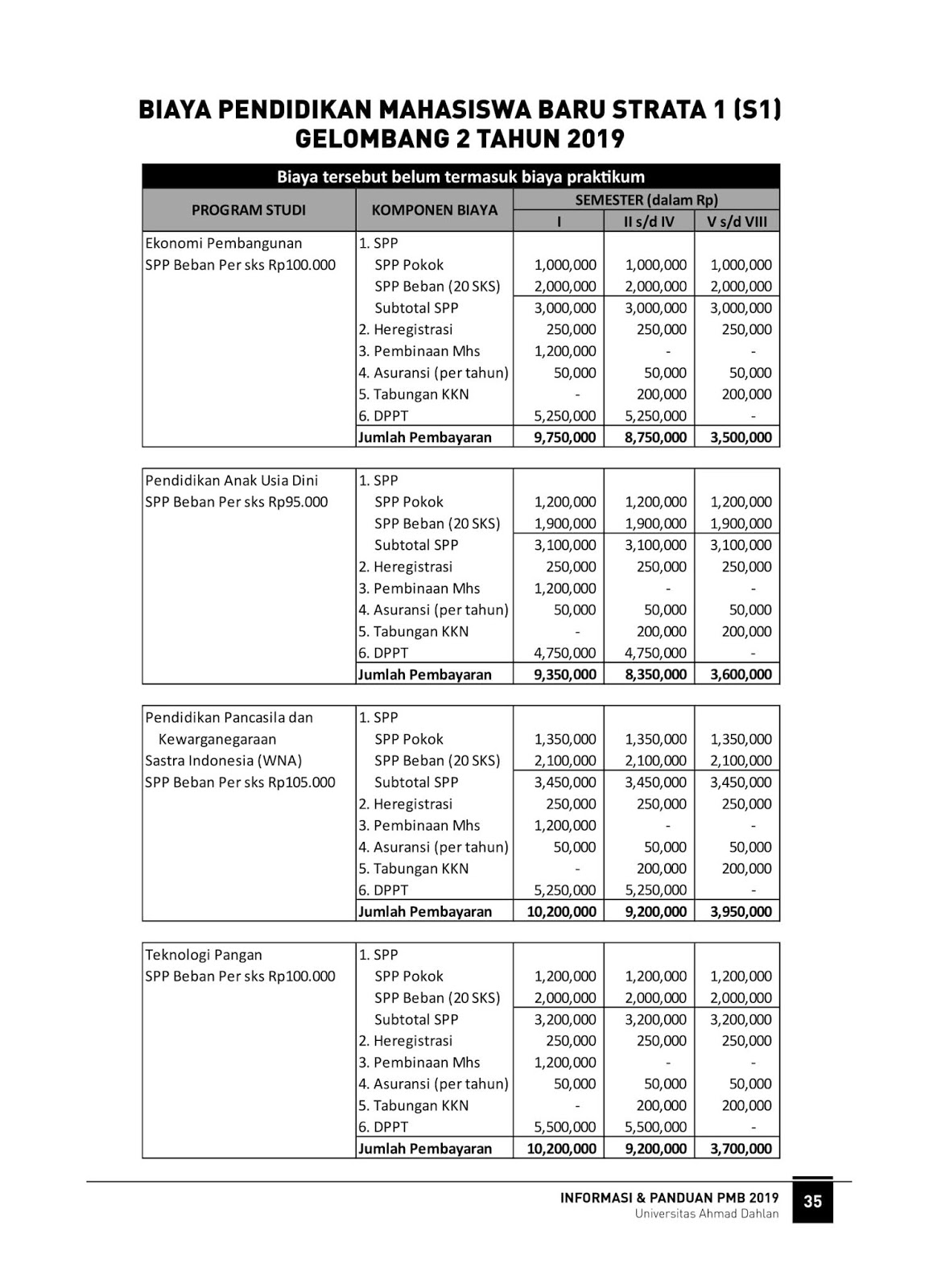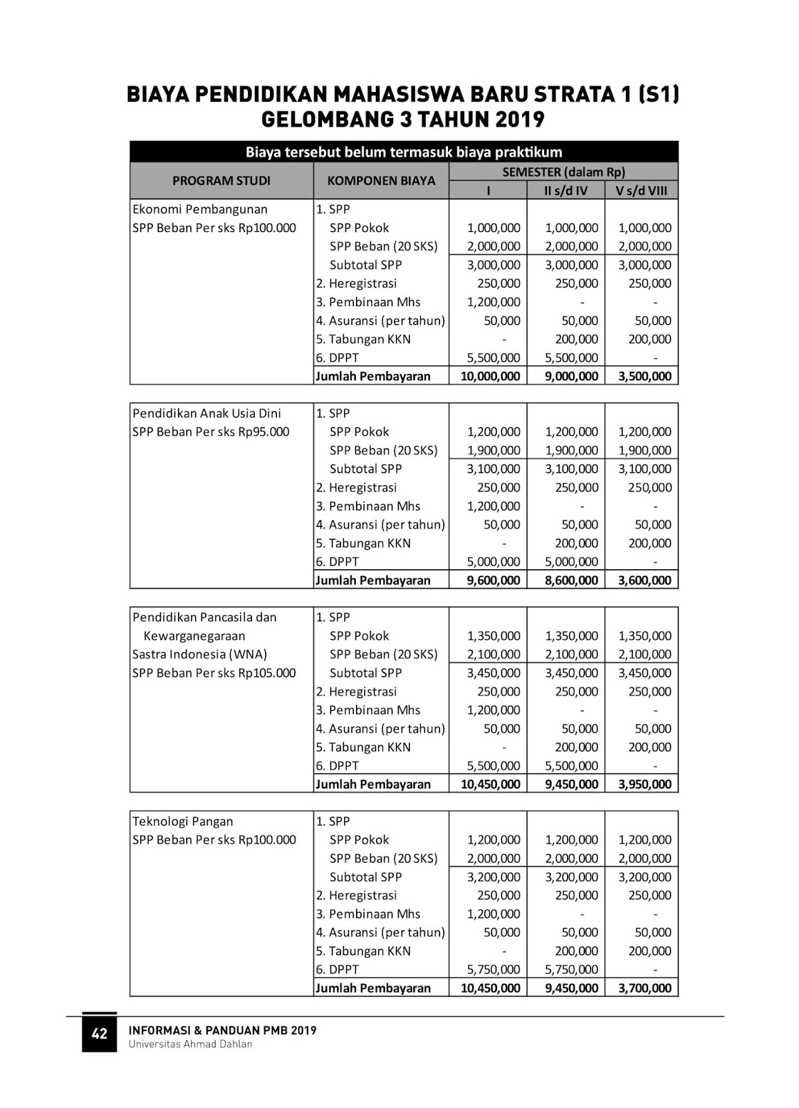 Adapun rincian biaya kuliah Universitas Ahmad Dahlan Tahun Ajaran 2019/2020 sebagai berikut :
