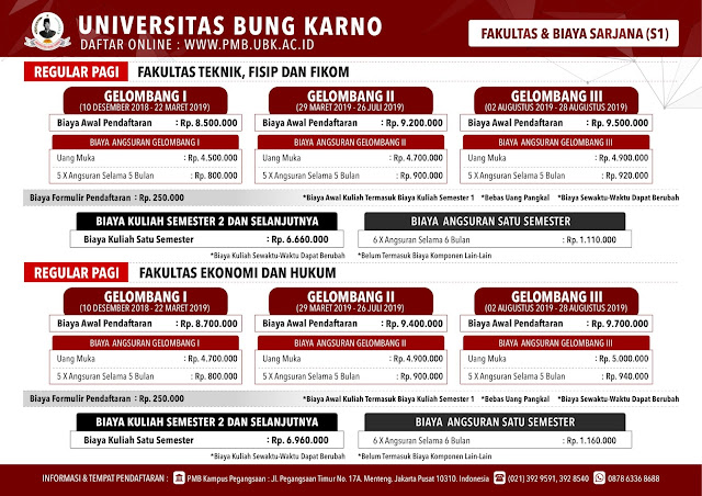 Bagi anda yang sedang mencari informasi Biaya Kuliah Universitas Bung Karno Tahun 2019-2020, berikut ini kami informasikan tentang Biaya Kuliah Universitas Bung Karno Tahun 2019-2020 sebagai berikut: